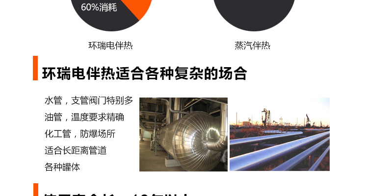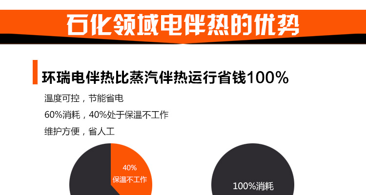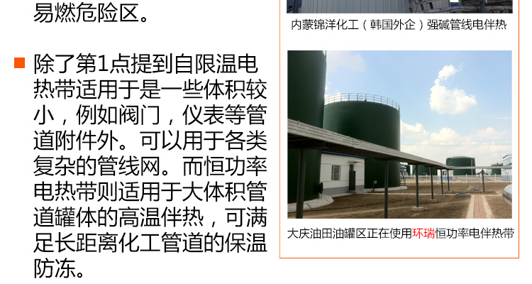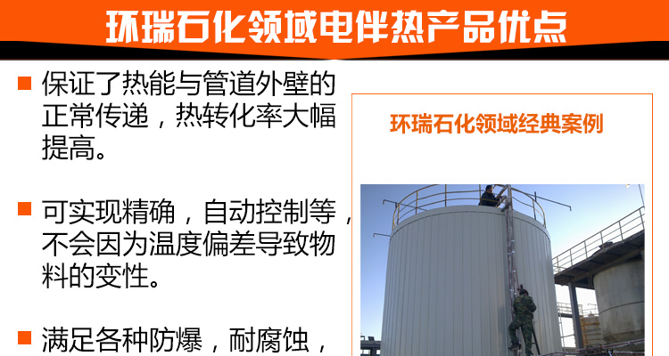 石化場所下的長距離管道,因輸送過程和長時(shí)間的儲存過程中會因散熱造成溫度下降,溫度的下降會使粘性物料的粘度升高,而對易結(jié)晶物料則可能使物料產(chǎn)生結(jié)晶,從而造成料液的輸送發(fā)生困難,嚴(yán)重的會造成管道系統(tǒng)的堵塞。為避免這種情況發(fā)生,必須對系統(tǒng)散失的熱量予以及時(shí)補(bǔ)充,即對系統(tǒng)進(jìn)行連續(xù)不斷地加熱。 |